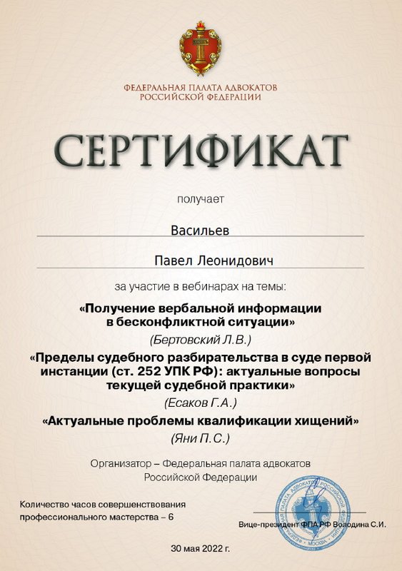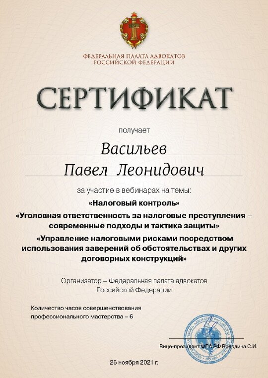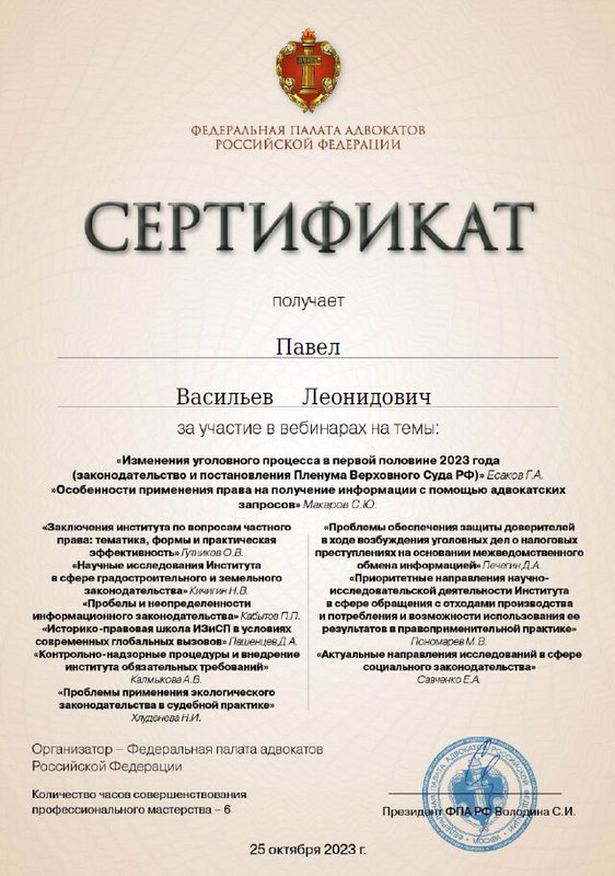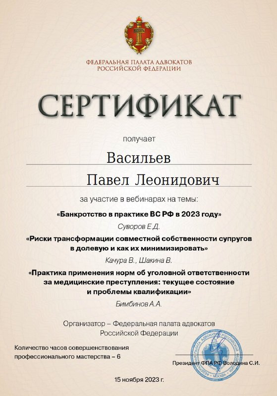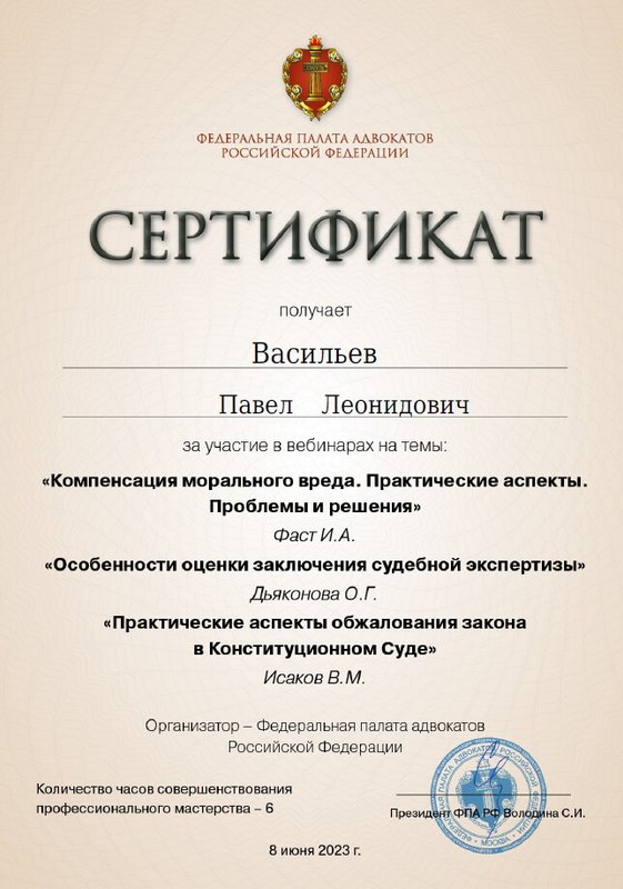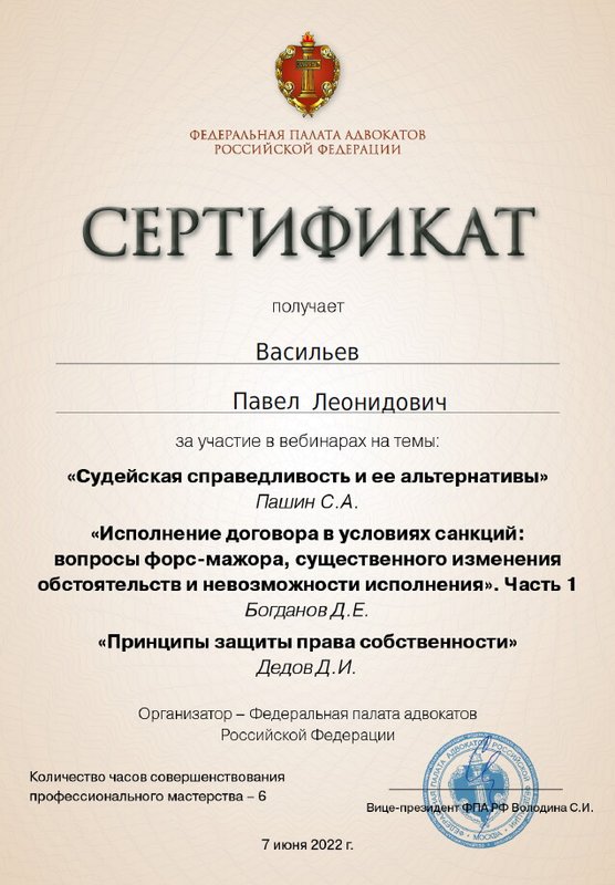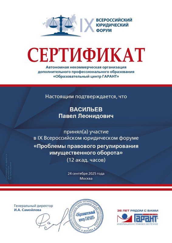 Неоднократно обращался к Васильеву Павлу Леонидовичу за консультацией по различным вопросам, ответы на которые помогали мне принять верное решение и избежать неприятных последствий. От Павла Леонидовича я получал практические советы по интересующим меня вопросам. Слава Богу судебных тяжб у меня не было, чем доволен, благодаря Павлу Леонидовичу. Рекомендую.